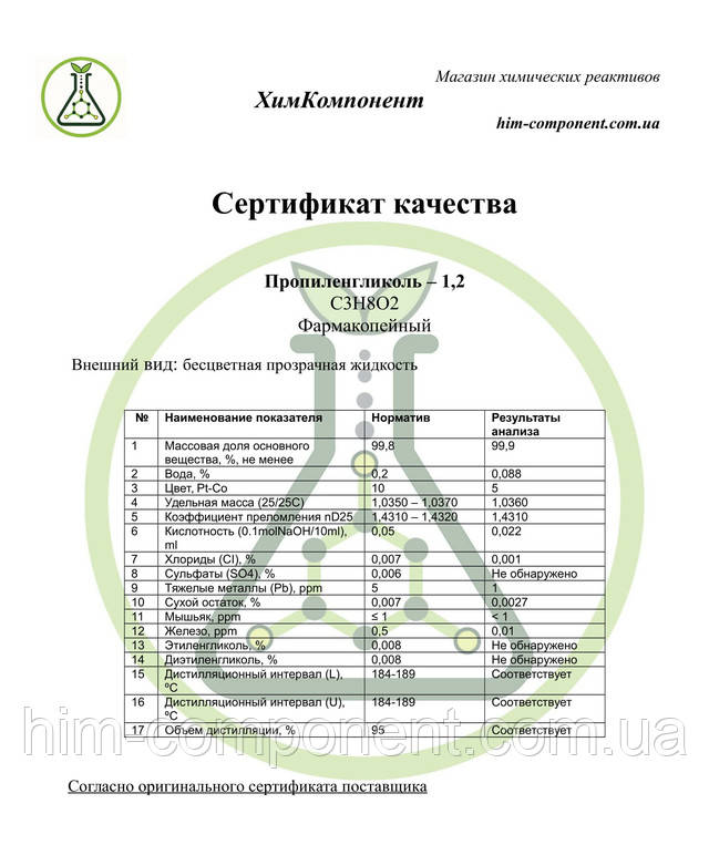 Пропіленгліколь — безбарвна в'язка рідина зі слабким характерним запахом, солодкуватим смаком, що має гігроскопічними властивостями.